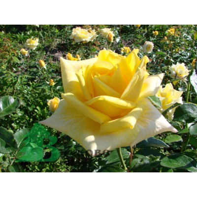 Распустившаяся полумахровая роза чашевидной формы имеет плотную структуру, состоящую из 30-35 равномерно распределенных лепестков. Крупный цветок привлекает внимание своей грациозной формой и объемом — диаметр составляет 10-11 см. Окрас у розы очень яркий — лимонно-желтый, иногда с красноватым оттенком.